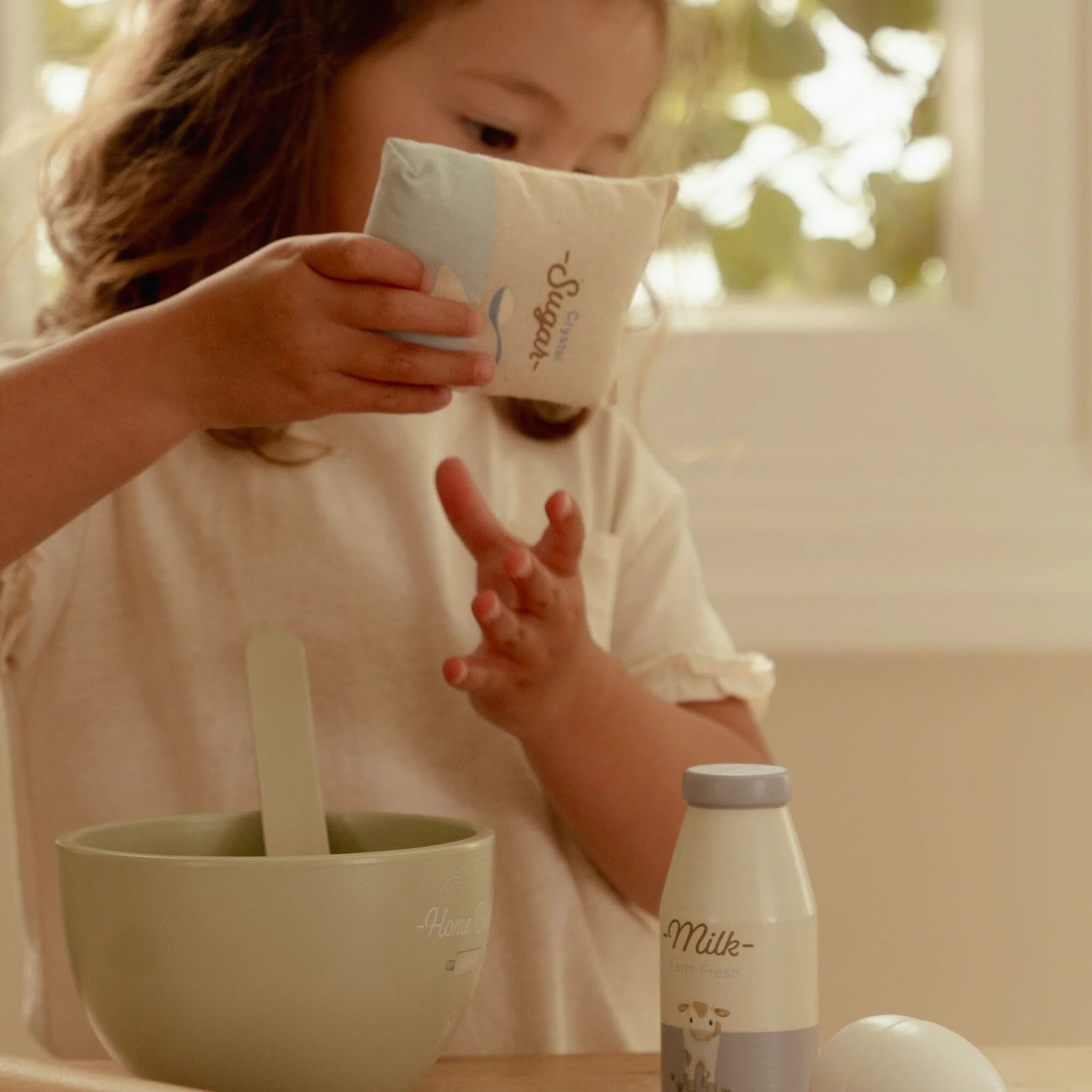 Time to bake something delicious! With this wooden baking set, little bakers learn all about preparing delicious cookies and pastries. The set includes a recipe card and all the essentials, such as a mixing bowl, baking tray with cookies, toppings, an egg, butter, flour, sugar, milk, and even colorful sprinkles. Roll out the felt dough with the rolling pin and decorate the cookies as desired. The perfect set for endless playtime fun in the play kitchen!