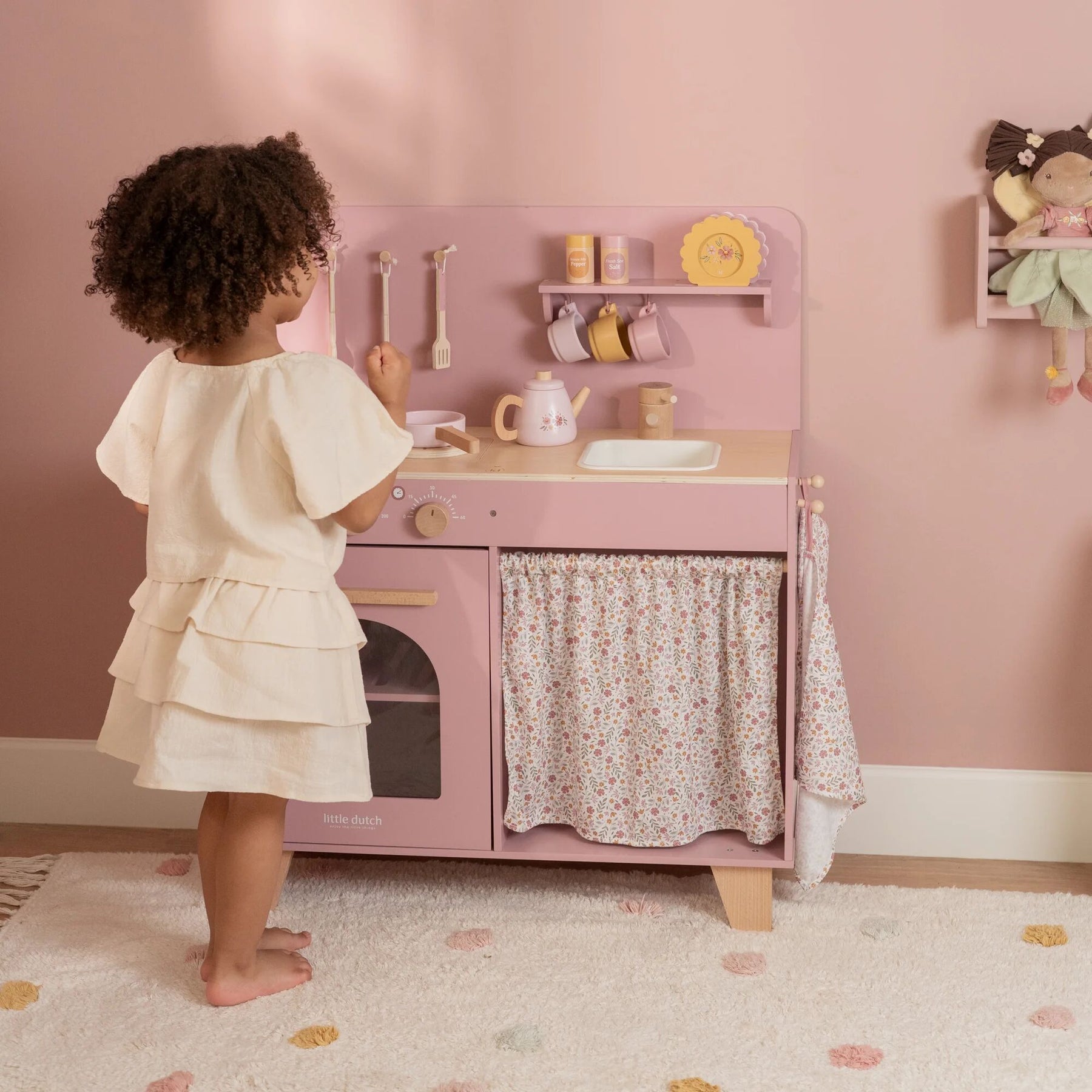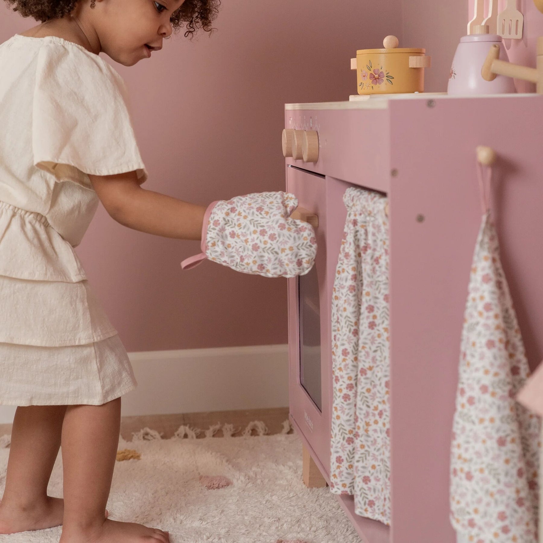 Little chefs, get ready! With this wooden pink play kitchen, you can dive into the world of cooking and baking. The set includes two pans, kitchen utensils, three cups, and three plates, all with cheerful illustrations. Bake a cake in the oven or cook vegetables on the stove, which makes a bubbling sound when you place a pan on it. Wash your hands in the sink and store your groceries in the cupboard. The microwave has real buttons with illustrations, and with the salt and pepper set, you can add extra flavor to every dish. The fabric curtain, tea towel, and oven mitt are decorated with the soft Soft Flowers print. A charming play kitchen for endless cooking fun!